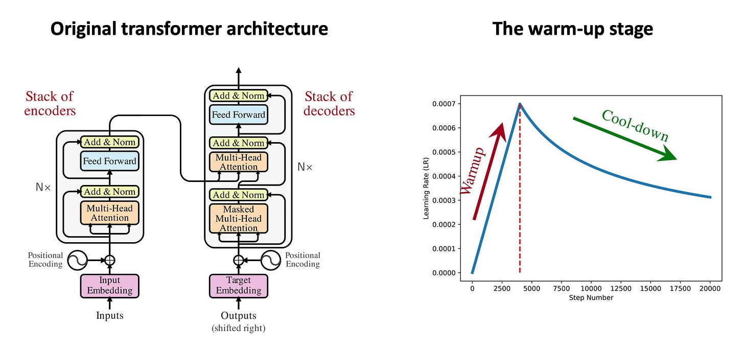 In the previous post, we delved into the transformer architecture in details. As a brief recap, the original transformer model is composed of a stack of encoders and a stack of decoder layers. The encoders and decoders are interconnected with cross-attention. Focusing on the encoders, each encoder layer is composed of two sub-blocks: 1) a Multi-Head Attention (MHA) block, and 2) a Feed-Forward Network (FFN). Furthermore, training the original transformer requires a warm-up stage, that is, we have to start training with a very small learning rate, and gradually increase the learning rate in the warm-up stage. Once we reach the maximum LR, then we can use any conventional learning scheduler as we wish.