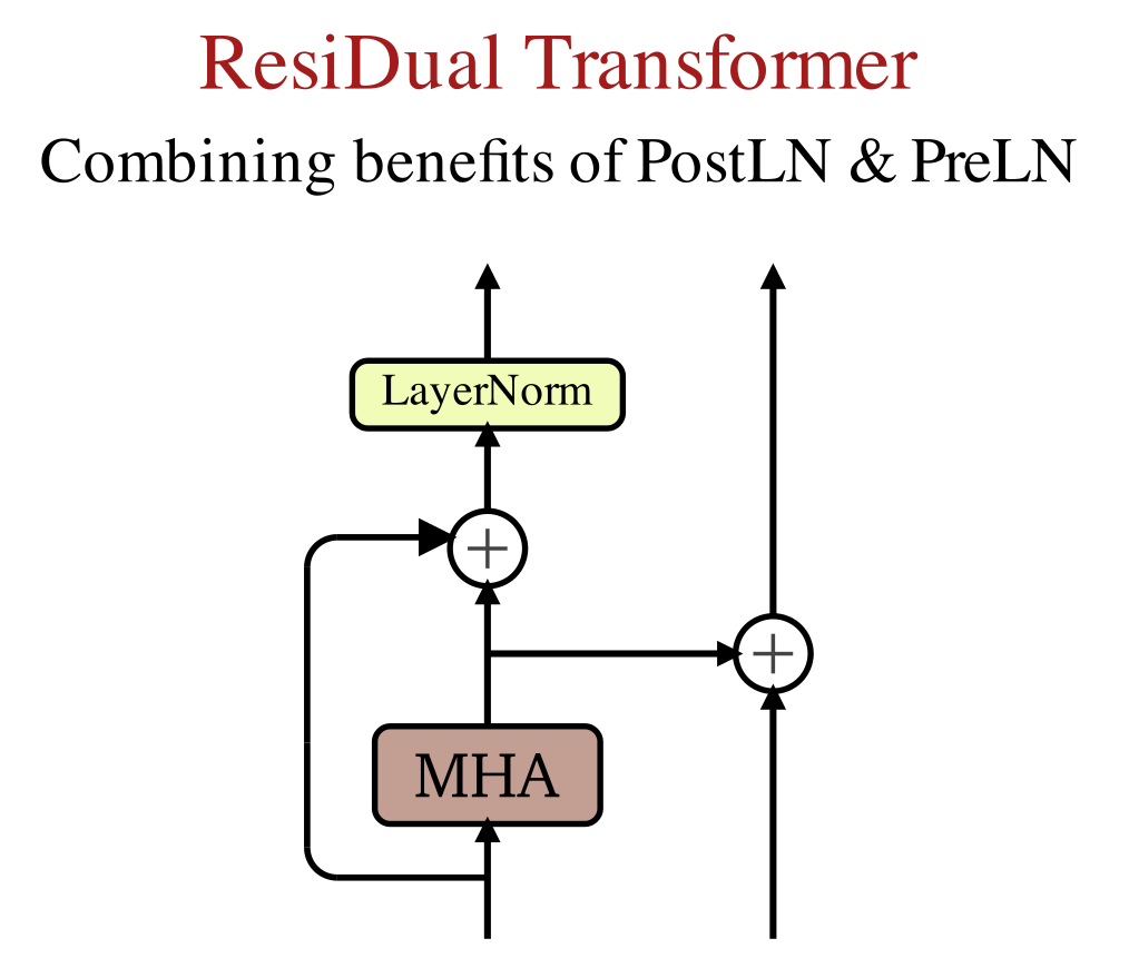 The right branch in ResiDual architecture takes the output of MHA and add that to the representations from the previous branch. The right branch is responsible for the easy passage of the gradients during back-propagation. Therefore, the ResiDual architecture takes best of the both worlds.